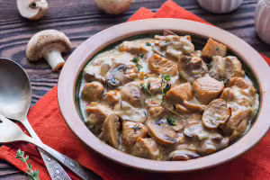 Add the can of mushrooms and their juice, as well as 5 teaspoons of veal stock.