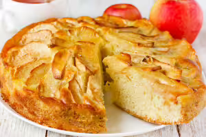 In a previously buttered mold or covered with parchment paper, place a row of apples cut into rings. Pour half the dough.