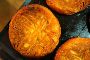 Make a puff pastry by rotating 45°C with the dough and stretching it twice by hand or with a floured pastry roller. Respect a 10 -minute rest time between the two kneaders.