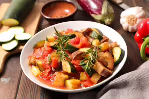Brown the pepper and the zucchini cut into cubes in the pan, then put the vegetables reserved before. Add the capacity of a tomato pulp box and thyme, stir and simmer between 15 and 20 minutes. Remove the thyme and pour the chopped basil. Serve with the accompaniment of your choice.